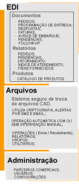 O Data Interchange Center da DI2S é um sistema abrangente de troca de mensagens e transformação de Dados que permite o envio e a recepção de arquivos e mensagens em qualquer formato (EDI - Email - Flat File - XML), para qualquer destino (PC - Mainframe - FAX - WAP - Postal) a qualquer hora. O sistema foi projetado para ser usado por empresas diferentes, ou por divisões diferentes dentro de uma mesma empresa, que utilizam formatos diferentes de mensagens e arquivos através dos mais variados protocolos de comunicação. É a maneira mais simples, mais barata, mais fácil e mais segura de integrar sua empresa com a sua rede de parceiros de negócios, fornecedores, transportadores, distribuidores, instituições financeiras e principalmente com sua rede de clientes. |